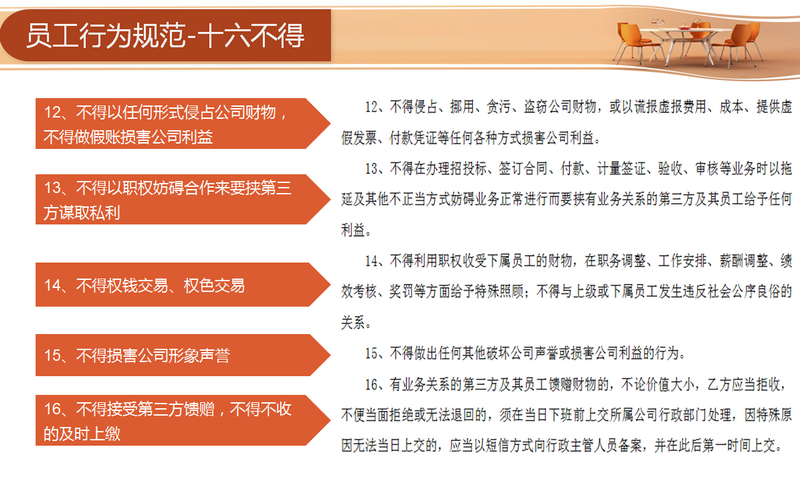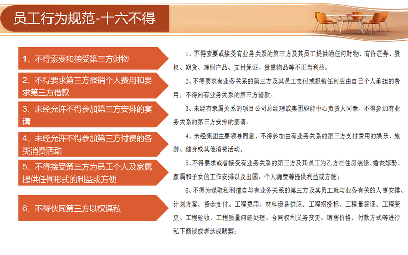 宣講環(huán)節(jié)主要從四個方面著手:分別為“目的、行為規(guī)范約定、違約責任與管理和連帶責任”。員工需要從十六方面規(guī)范自身的行為,包括不得索要和接受第三方財物、不得要求第三方報銷個人費用和要求第三方借款、未經(jīng)允許不得參加第三方安排的宴請等等。